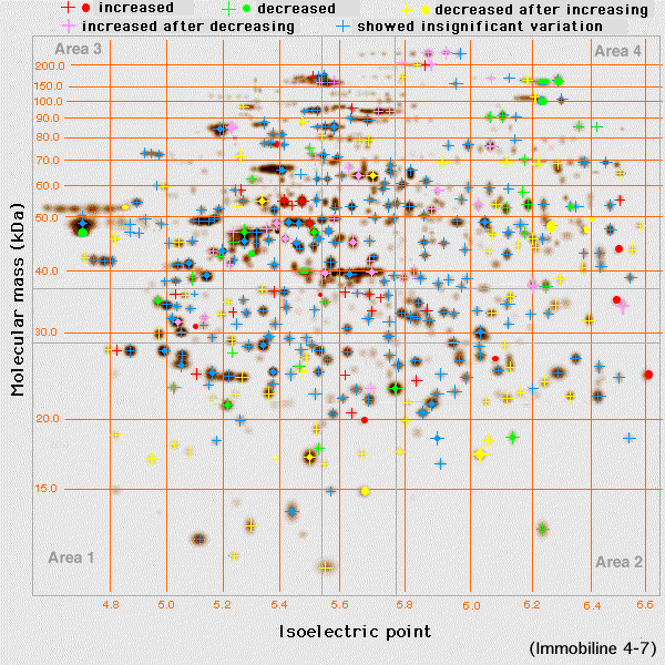 The clickable 2-D gel image map of the TIG-3 which is a normal human diploid fibroblast cell strain established in our institute. The colored markers indicate the quantitative variation of each spot protein in the course of aging.
